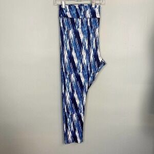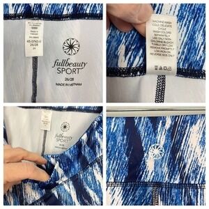 Fullbeauty Sport Women's Size 26/28 Blue and White Leggings Stretch Activewear. Blue and white pattern athletic leggings of 86% polyester, 14% spandex. Style # 92666. 45-0743-0. Size 2X (26/28). Machine wash, tumble dry. In great, pre-owned condition. Measurements taken flat: waist unstretched: 22.5", stretched: 29", rise: 15.5", inseam: 29".