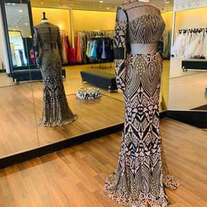 fully beaded with illusion mesh along chest and midsection, slit