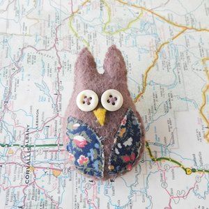 An adorable handmade felt owl brooch with fabric scraps and button eyes.