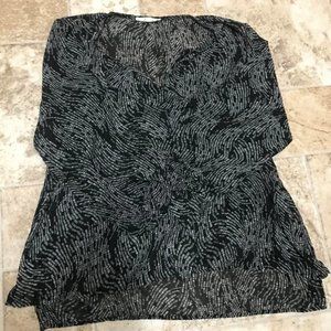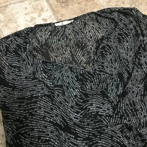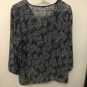 Great preowned condition, lightweight, slightly sheer, black/white patterned fun2fun top! Cute ruffle around neckline and down front of top.