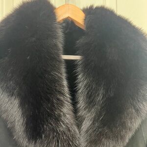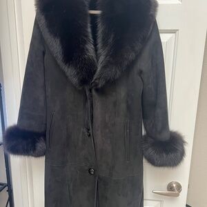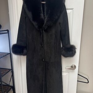 This is real fur made from a NYC furrier. Long black shearling lined coat with fur collar and fur around wrists. Size 6.