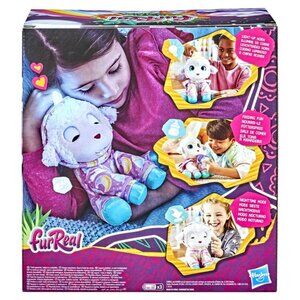 furReal Sweet Jammiecorn Lamb Interactive Plush Toy, Light-Up Toy with 30+ Sounds and Reactions, Lamb Soft Toy, Ages 4 and Up Reach for the furReal Sweet Jammiecorn Lamb light-up toy day and night. She's soft, snuggly, and kids ages 4 and up can show this plush pet just how much they care. In day mode, feed her with the included bottle, and she’ll make cute eating noises and playful sounds. What makes this interactive toy even more adorable? Kids can cuddle up with her at bedtime, too. When it's time for lights out, press her horn to close her eyes. The horn will also change color from a happy yellow for day to a soothing blue for night. If kids want to hear lullabies or calming white noise soundscapes, just press the pet’s ear in night mode. This day-to-night friend makes a wonderful gift and a cherished friend. furReal and all related properties are trademarks of Hasbro. Includes pet, bottle, and instructions. Ages 4 and upWarning: Small parts may be generated. Requires 3 AAA batteries, included © 2021 Hasbro. All rights reserved.