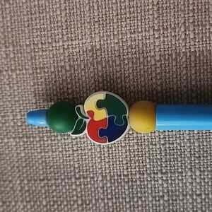 Vibrant pen with a puzzle apple design. Features blue, green, yellow, and red colors.