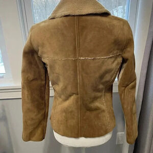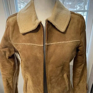 Vintage Gap suede shearling jacket in brown with tan trim highlights. Has pockets and zip front closure. Size XS. Great condition. Has zipper sleeve detail.