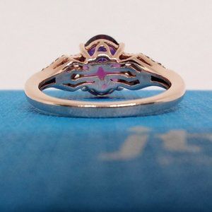 this ring is a must see! it is genuine 2ct grape garnet with genuine .17ctw pink sapphires & genuine mined from the earth white zircons on the shoulders. it is in solid 10k rose gold, it is in perfect condition & stamped, comes with gift box, size 5.5. jtv, original receipt available with purchase of this ring.
