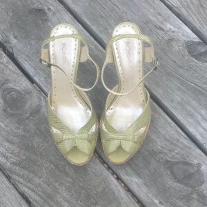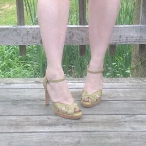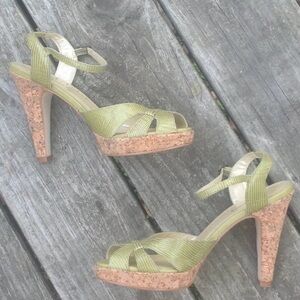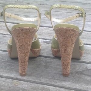 Genuine leather upper, synthetic lining, genuine cork on heels and platforms. Worn twice, out for lunch and dinner. Haven't been walked in much. Just like new. Great classic, vintage style in olive green alligator pattern embossed leather.