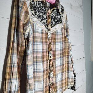 gimmicks by BKE 100% cotton Western Boho Aztec lace trim button down shirt.