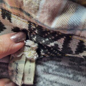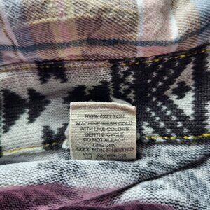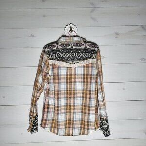 Mix of Boho western with a distressed flannel appearance but material is softer and lightweight cotton. Colors in shirt are brown, pink, blue, tan, black and cream. One cuff has flaw (pictured in photos) otherwise great used condition.