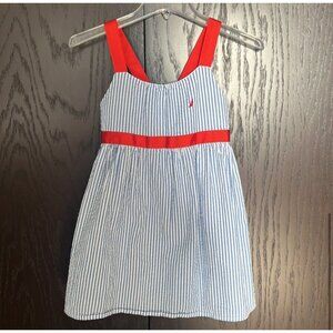 girls seersucker blue/white striped dress w/ red ribbon strap sz 6 EUC