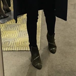 Olive green suede Giuseppe Zanotti pointed-toe booties with silver-tone hardware, zip detail throughout and zip closure at sides.