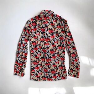 vintage nylon disco button down by givenchy for chesa. cherry illustration print, dagger collar, excellent condition.
