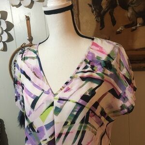 V neckline short sleeve hi low hem. Gently preowned condition. See photo for material details