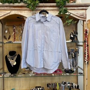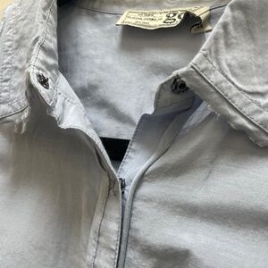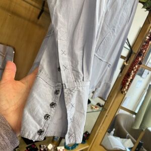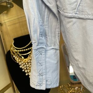 go by Go Silk women’s light blue collared shirt, raw cut detail on collar, one chest pocket, snap button on cuff, raw edge stitching, wrinkle design, lightweight, 60% silk, 40% rayon, size XS.
