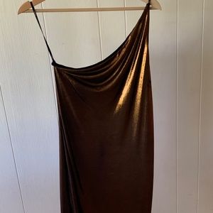 gold shiny body con dress. it is pretty short ( above the knee) and is off the shoulder on one side. - inspiration Kylie Jenner outfit