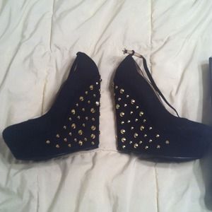 These babies have never been worn (only tried on once) They are black suede wedges with gold detailing / gold spikes! They're very cute!