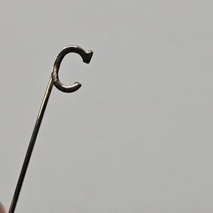Gold tone stick pin with the letter C. Has some minor wear on the cap, but in otherwise good condition. No markings to indicate brand or metal content.