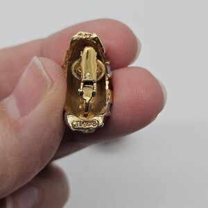 Half-hoop clip on earrings. Curved, in a gold tone metal with diagonal bands of red and light purple enamel. One earring has a plaque with some sort of marking on it, but I can't make out what it says. Penny shown for scale, will not be included with your order.