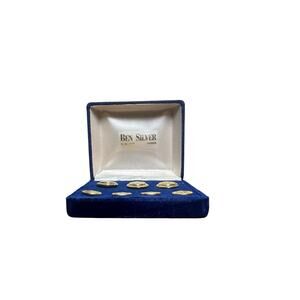 The product is a set of gold-plated Ben Silver blazer buttons featuring the Vassar College logo. These buttons are crafted from silver material, giving them a luxurious and elegant look. Perfect for adding a touch of sophistication to any blazer or jacket, these buttons are a stylish closure option for any craft or sewing project.