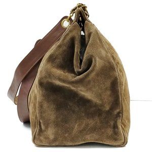 Bag was not worn much and is still in great shape. All hardware works. Snaps have magnets inside so they pop together when put nearby. All sips and snaps in good shape. Inside clean. Outside looks very nice. Bag has been used so it does not look new, but very good. This bag is heavier with lots of high quality seude leather which is enjoyable to the touch. Larger normal size daily bag. Medium brown color. Handles are smooth on one side and suede on the other.