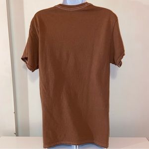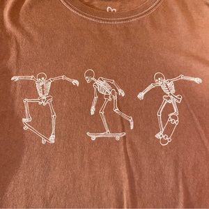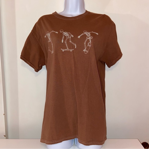 brown graphic tee from tillys. white skateboarding skeletons design on chest. oversized look. white stitching at neckline, hem, and sleeves. size S. worn a couple times. no obvious signs of wear.