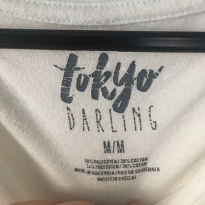 used but in good condition! cropped but more along the lines of a regular tshirt. super soft somewhat sheer material.
