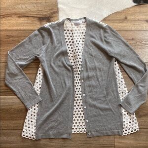 gray cardigan sweater with a white, eyelet-patterned fabric lining the back and the inside of the front panels. The sweater has long sleeves and a v-neck, and it appears to be buttoned down the front with small, white buttons. The eyelet fabric creates a decorative contrast against the solid gray knit of the sweater. Open to offers and bundle items to save!