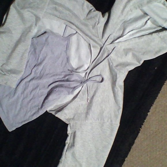 its a gray croped hoodie, comes with tank top size m,hoodie size m, hoodie is from the brand romwe