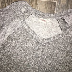 size small grey sweater, looks great with a medium wash jean. very comfortable and not tight fitting. worn a few times, but has no pulls and is is great condition.