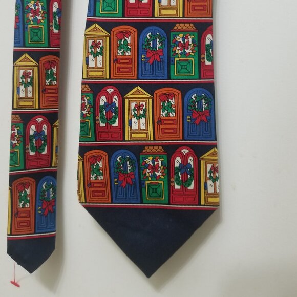 Bright tie with an interesting pattern of doors with wreaths, Andhurst brand. It's 58 inches long from tip to tip, and is 100 percent silk.