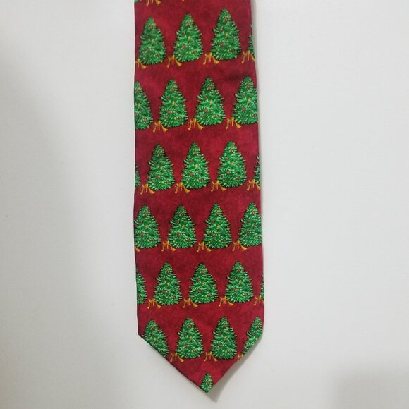 Luxurious Hallmark textured red tie with green Christmas trees. It's 57 inches long from tip to tip, and 100 percent silk.