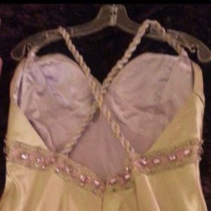 Green and lilac prom dress with beaded detail and braided straps. Crisscros back and high slit up the side.