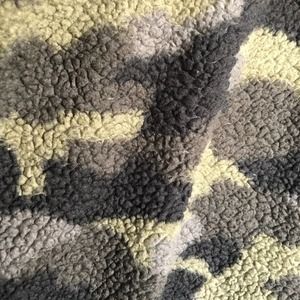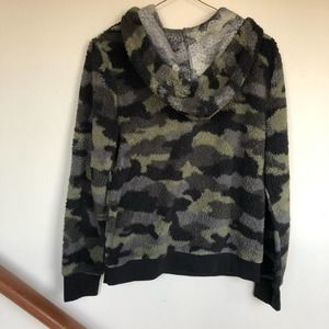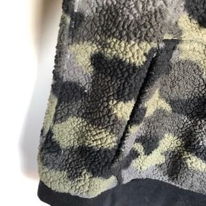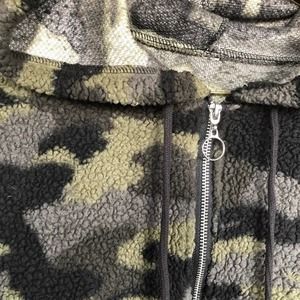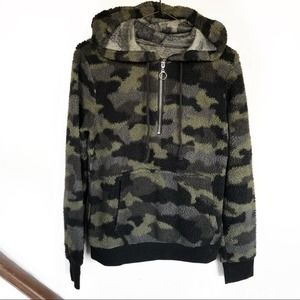 green camouflage faux sherpa fuzzy quarter zip hooded long sleeve sweater