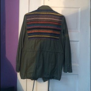 green jacket with tribal print. zippers and buttons closed. 4 pockets on front and string adjusters on bottom. worn once. very cute and comfortable