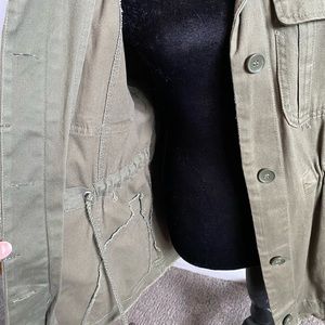 button up green jacket w pink rose decal on the back. 2 side pockets and 2 chest pockets. pull strings to cinch waist