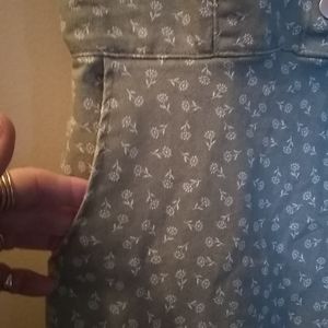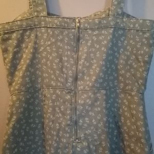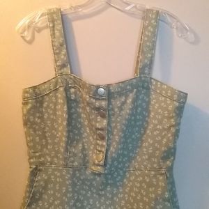 soft moss green twill with all-over tiny white daisies, back zipper, front buttons, 1 1/4" straps, 32" bust, 28" waist, 32" hip, side diagonal hand pockets, back length from base of neck 34"