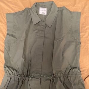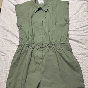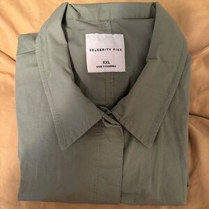 The product is a XXL size green romper with a collared neckline and buttons down the front. It features pockets on both sides and is designed as a one-piece outfit. The romper is part of the celebrity pink brand and is specifically created for plus-sized women looking for a stylish and comfortable option. The fabric used in the romper is indicated as down, adding a unique touch to the overall design. Perfect for casual outings or lounging, this romper offers a trendy and practical wardrobe choice for women.