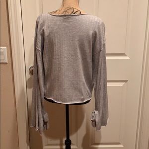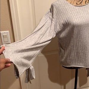 Soft ribbed sweater with ties on sleeves. 52% viscose, 26% nylon, 22% polyester. Grey in color