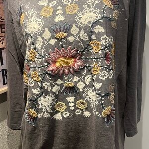 This gray t-shirt features a relaxed fit and a striking graphic design on the front, making it a standout piece in any wardrobe. The short sleeves and comfortable style make it perfect for casual outings. this is a distressed look and is emboossed as well as embroidedred by the designer its a boxy popular style