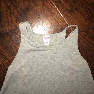 Grey. Loose fitting. Extra small but fits more like a small/medium. Comes down to about mid thigh. Stretchy Tshirt material