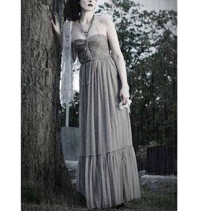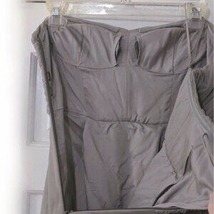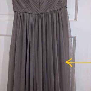fully lined, zips up the side, has little belt loops - on the inside of bodice: removable bust padding, rubbery grip along top of bust and a stretchy internal 'belt' to keep everything in place - full, floaty skirt with sheer layers and an opaque lining - outer layers of skirt are not hemmed