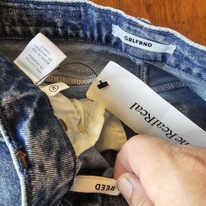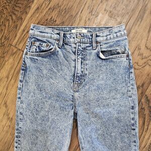 The product is a pair of Grlfrnd jeans in size 26, featuring a light wash and a straight leg design. The raw hem adds a modern touch to the classic blue color, making them a stylish and versatile choice for women's clothing. Perfect for casual outings or dressed up with heels, these jeans offer a comfortable and trendy option for everyday wear.