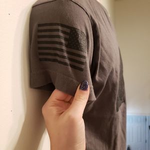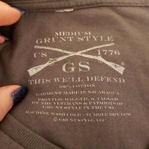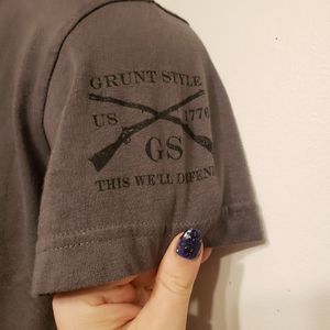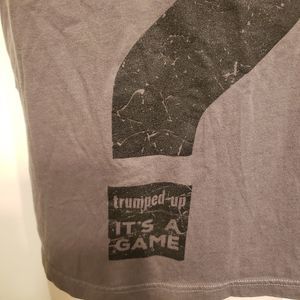 EUC size M mens gray Grunt style v neck top. Question mark with "trumped up its a game".