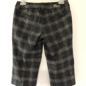 Black women capris with gold and silver lines stretch with tartan plaid 62% polyester, 32% Rayon, 3% Silk lined shorts.