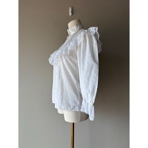 features high neckline, button front, ruffle lace cuffs, eyelet body, ruffle chest + back