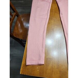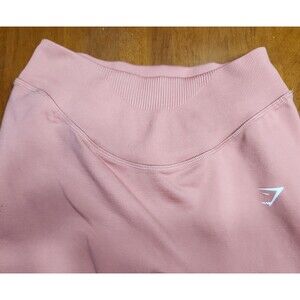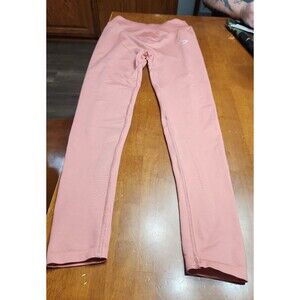 gymshark leggings, unknown style & size. These do have a seam & also have small pinpoint holes (not a defect but done purposely!) on both sides of thighs & back of both calves. There is no tag so I have measured the waist & it's quite small, as pictured. These are in great condition. No stains or tears seen. Color is between a pink & peach.