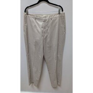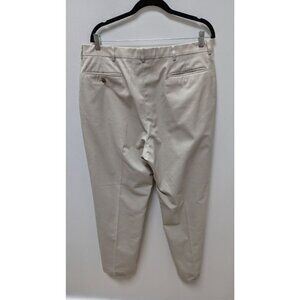 haggar Light Khaki Men's Straight Leg Chino Pants. Size 36x30. Gently used, with some minor spotting, snags, and staining to the hems. It has a zipper and hook clasp front closure with 4 pockets, belt loops, and a straight leg style.