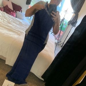 Hailey Logan By Adrianna Papell Dark Blue One Strap Floor Length Gown Size 3/4. Has a high slit in the front. Back is open and strappy. Lots of bedazzled pieces! Picture shows the only missing jewels that I could see. Lower back is rouched and very flattering. Zips down the side. Was only worn once and dry cleaned. Approximate measurements while the dress is lying flat are.... pit to pit 13.5"....waist 11".....top of shoulder to bottom hem 62"...