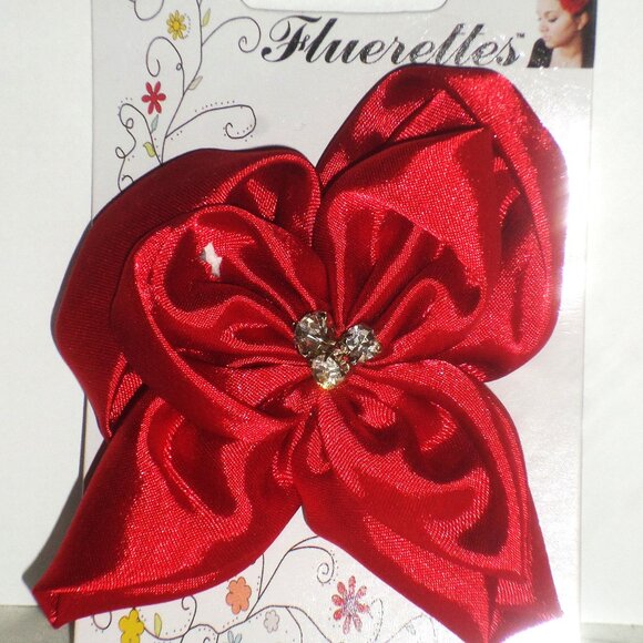 Red, satiny, 7 multi-fold petals rose with 3 crystal-like stones in the middle