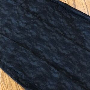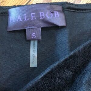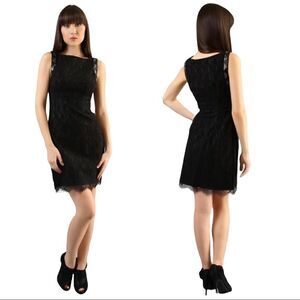 Hale Bob black bonded stretch sleeveless lace dress with beaded sleeveless arm. Scalloped hem. Side zip closure. Folded pleating on back. Gently used condition.