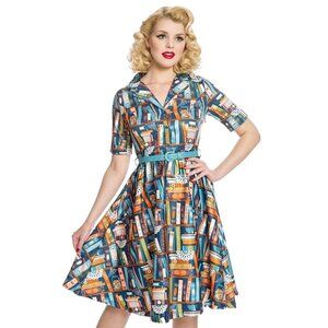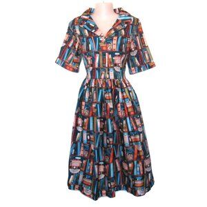 creepy witch library librarians cute retro swing circle skirt shirtdress blue colorful spider spiderwebs web cobweb spooky gothic spells magic wicca dark academia 6 8 short sleeve rockabilly psychobilly whimsigoth